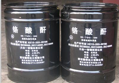 鉻酐是紫紅色針狀或片狀晶體。比重2.70。熔點(diǎn) 196℃,在熔融狀態(tài)時(shí),稍有分解。鉻酐極易吸收空氣中的水分而潮解,易溶于水。15℃時(shí)的溶解度為160 克/100克水,溶于水生成重鉻酸,也溶于乙醇、乙醚和硫酸。
